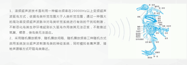 ① 、采用双方式——语音+超声波进行驱鸟,提升驱鸟效果;
