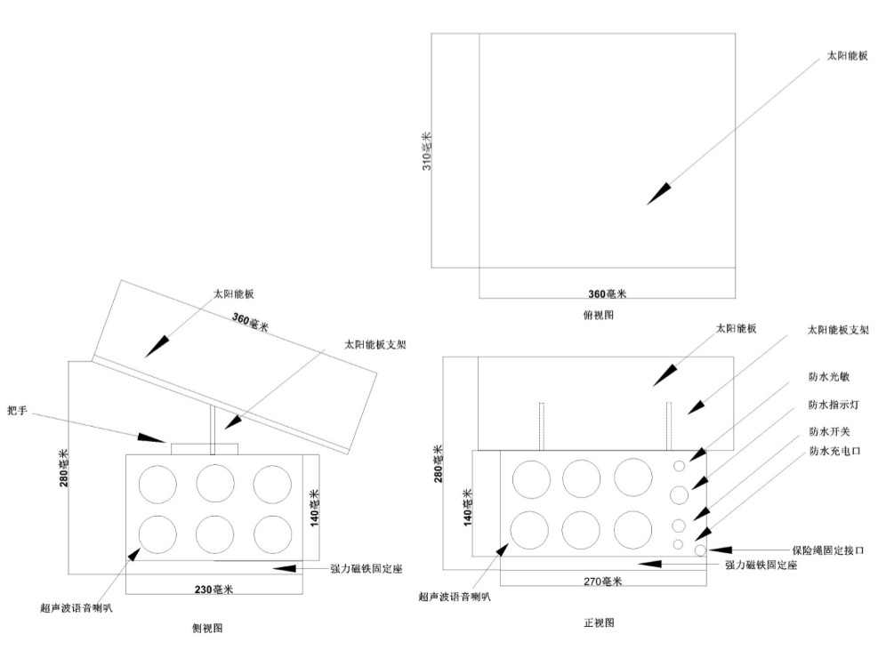 ①、驱鸟器安装在航标船的甲板上,随放随装,使用强力磁铁吸附,并使用保险绳固定。装置结构示意图如下: