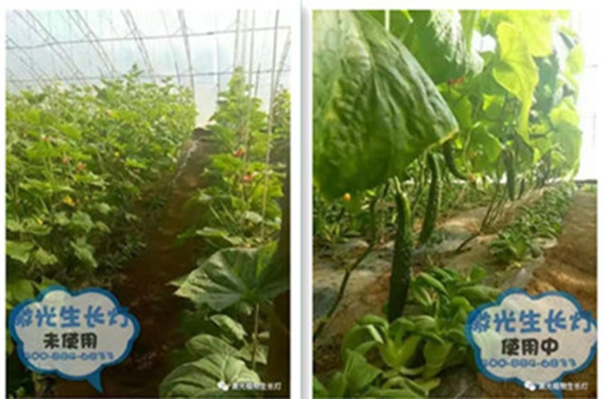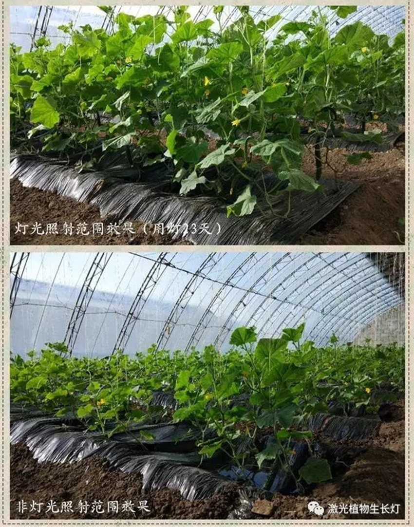 未使用激光植物生长灯(瓜果少,黄瓜弯曲、卖相差) 使用激光植物生长灯(瓜果多、黄瓜笔直、卖相好)